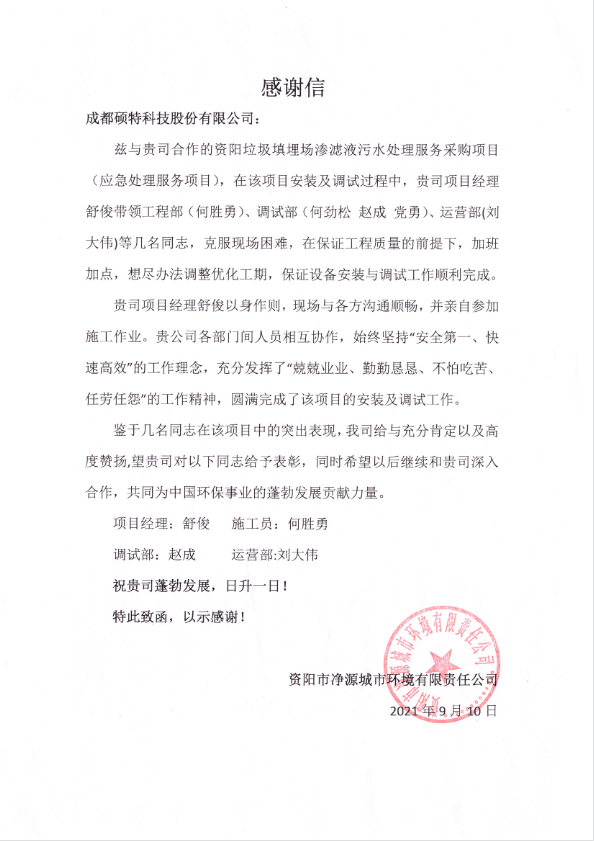 2021年2月,龐俊國帶領(lǐng)團(tuán)隊配合運(yùn)維、技術(shù)部門完成貴陽比例壩垃圾滲濾液應(yīng)急處理項(xiàng)目提標(biāo)改造竣工驗(yàn)收并投入生產(chǎn);9月,積極響應(yīng)環(huán)保局要求,克服各種困難,完成在線檢測系統(tǒng)所有手續(xù),提前推進(jìn)貴陽項(xiàng)目的竣工驗(yàn)收并確保項(xiàng)目持續(xù)穩(wěn)定地生產(chǎn),得到業(yè)主一致好評!
